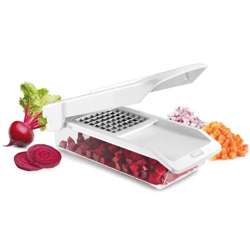 Questo affetta tutto è l’utensile perfetto per tagliare frutta e verdura fresche a cubetti o in stick. Ha in dotazione 2 lame in acciaio inox, per tagliare in due misure diverse. Ha un trattamento antiscivolo per tagliare in tutta sicurezza, e ha in dotazione un accessorio per la pulizia. Perfetto per tagliare ed affettare carote, patate, cipolle, sedano, cetrioli, barbabietole, mele, pere, pesche e tanti altri ortaggi. Dimensioni: 26,5 x 12 cm.
