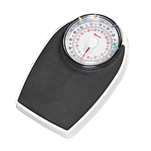 BP55 Bilancia meccanica con lettura del peso facilitata grazie al grande visore che integra al proprio interno la doppia scala di pesatura in chili e libre, questa bilancia meccanica ad alta precisione comprende una ghiera di registro per la taratura iniziale, un'ampia e sicura pedana in materiale antiscivolo rifinita in gomma ed è completa di 4 indicatori segna-peso di diversi colori per tenere sotto controllo il peso di ogni membro della famiglia.