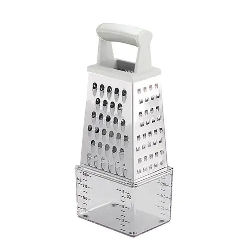 Tante grattugie in una sola: ci sono fori diversi su ogni lato, così puoi grattugiare gli alimenti, o ridurli a fettine, a scaglie o a julienne, ogni volta come più ti piace. Indispensabile per adattarsi ad ogni esigenza e tipo di cucina! Questa è prodotta interamente in acciaio inox di altissima qualità e plastica resistente; è provvista di un recipiente sottostante, in plastica trasparente e con scala graduata, per raccogliere gli alimenti grattugiati.