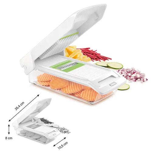 Questa mandolina/grattugia multifunzionale è lo strumento perfetto per chi ama preparare frutta e verdura in modo veloce e avere la cucina in ordine. Con otto lame intercambiabili, serbatoio capiente e guardia di protezione, questo utensile unisce funzionalità e sicurezza in un formato compatto. Può affettare e grattugiare in vari modi: tagliare a dadini e tritare frutta e verdura e grattugiare ingredienti diversi, raccogliendoli nel capiente serbatoio senza sporcare in giro. Si usa in tutta sicurezza grazie alla guardia protettiva. Le lame sono in acciaio inossidabile di alta qualità e le parti in plastica sono resistenti, con trattamento antiscivolo per rendere la mandolina stabile sul piano di lavoro. La mandolina è salvaspazio, i suoi componenti si ripongono ordinatamente uno dentro l’altro. Oltre allo spazio, risparmi anche tempo, perché puoi tagliare, tritare e grattugiare senza dover cambiare utensili.