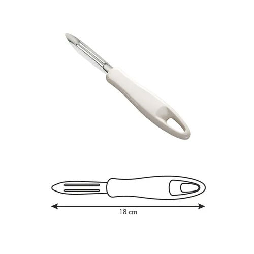 Sbucciatore prodotto in acciaio inox di prima qualità e plastica bianca resistente. La particolare forma permette una sbucciatura precisa e la lama appuntita è utile per eliminare eventuali occhi o difetti. Provvisto di un'asola per appenderlo alla barra in cucina.