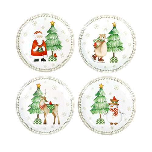 I protagonisti del Natale sfilano sulla tavola con buonumore e spensieratezza: tramandano una storia che sa di tradizione, su candide pagine di porcellana, tessile e melamina. La nuova collezione “Racconti” firmata Brandani accoglie le feste con armonia, eleganza e gioiosità! Il set di 4 piattini pane&pastry in porcellana sfoggia i deliziosi personaggi tipici delle feste; renne, pupazzi di neve, orsetti, abeti e l’immancabile Santa Claus accoglieranno gli ospiti tra toni di verde e rosso!Dimensioni CM: D 15