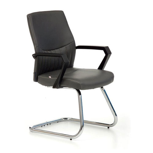 Poltrona per ufficio modello Sake Fissa, struttura in acciaio cromato "a slitta", braccioli in nylon, seduta e schienale con rivestimento in similpelle.