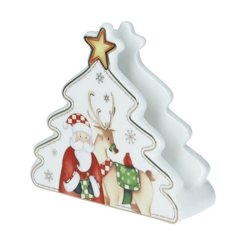I protagonisti del Natale sfilano sulla tavola con buonumore e spensieratezza: tramandano una storia che sa di tradizione, su candide pagine di porcellana, tessile e melamina. La nuova collezione “Racconti” firmata Brandani accoglie le feste con armonia, eleganza e gioiosità! Il portatovaglioli Racconti, in raffinata porcellana new bone, sfoggia i deliziosi personaggi tipici delle feste; la sua forma ad abete natalizio, inoltre, la rende deliziosamente particolare! Dimensioni CM: 13,5X4X12,5H