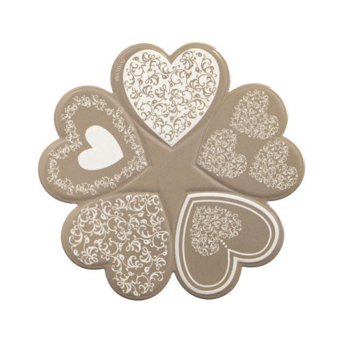 Il nuovo sottopentola cuore in ceramica Riccioli di Fata un raffinato utensile decorato da floreali motivi che vanno a comporre romantici cuori. Permette di proteggere le superfici dal calore delle stoviglie così da servire le pietanze direttamente in tavola. Non perderti tutta la collezione Riccioli di Fata: leggiadra, garbata e sofisticata, arricchirà la tua tavola con un immancabile tocco di dolcezza, al sapor di famiglia.Dimensioni CM: D 20