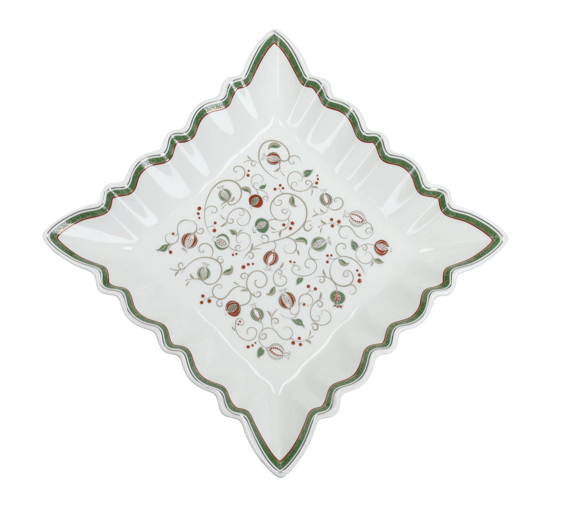 La collezione Tempo di Festa firmata Brandani si compone di particolari accessori per la tavola dai classici ornamenti natalizi. Nuovo arrivato nell’elegante linea, il vassoio quadro in porcellana dai bordi frastagliati sfoggia le affascinanti colorazioni tipiche dell'inverno, dal verde al rosso fino allo scintillante oro. Ideale per completare la tua tavola con un tocco di charme e graziosità, portando in tavola le tue delizie.Dimensioni CM: 23,5X23,5